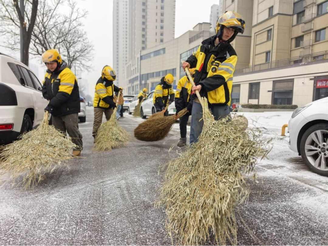 ▲外卖小哥在太原万柏林玉门南路扫雪(图源:太原新闻网)