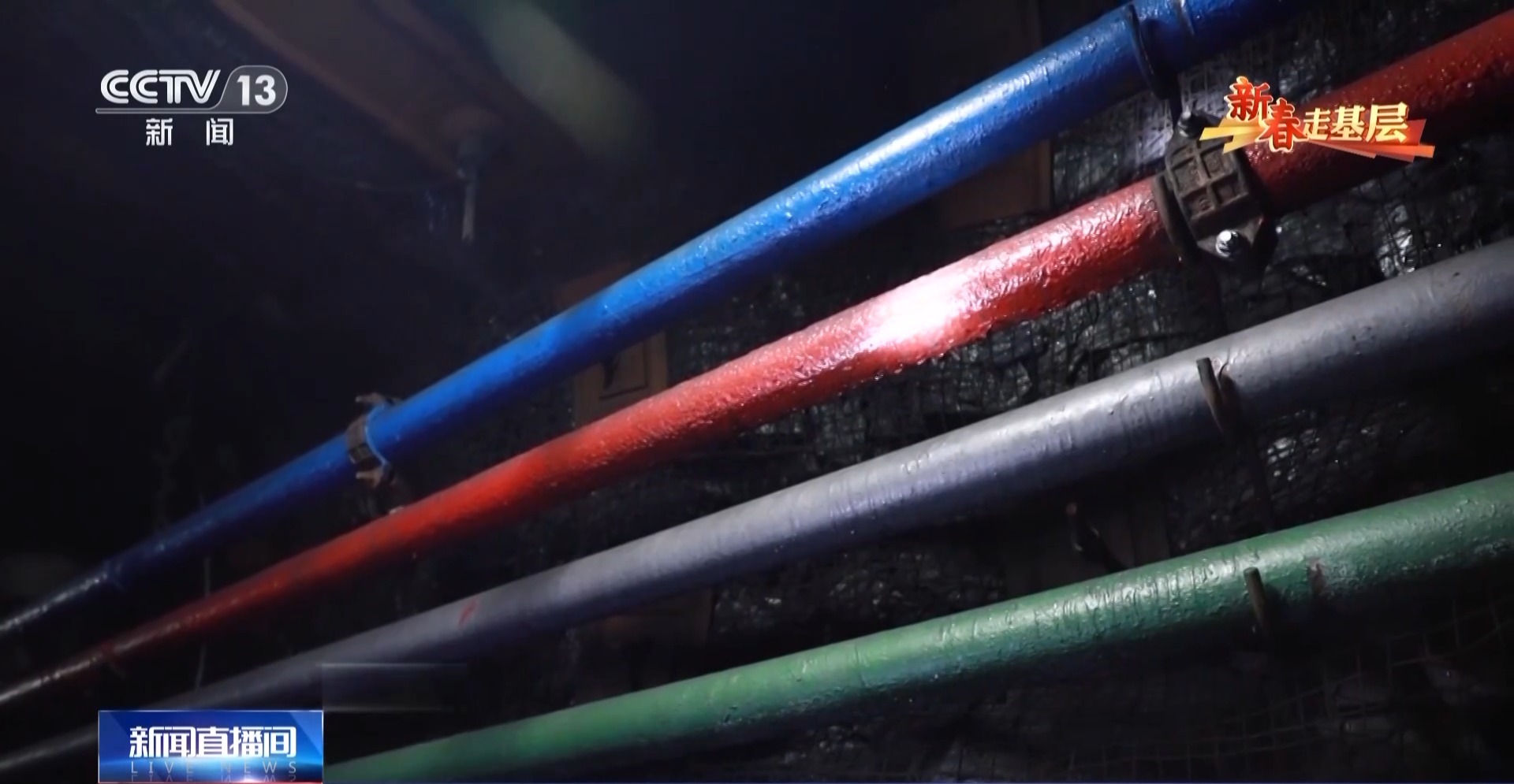 这根蓝色管道正在输送氮气,给采煤工作面降温,防止煤层自燃;红色管道用于通风,降低现场瓦斯浓度,让矿工随时可以呼吸到来自地面的空气;而灰色管道则要将工作面不断渗出的积水排走;绿色管道相当于自来水管,作业现场用水都靠它,特别是喷雾抑尘系统。