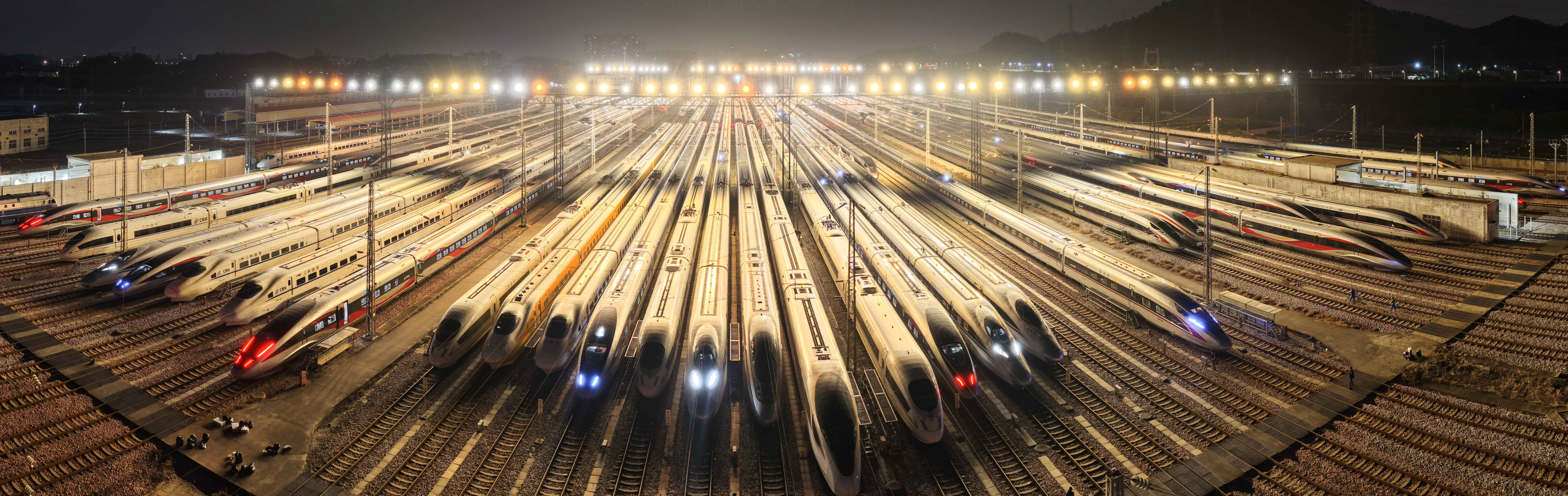 △ 2026年2月1日,动车组列车停靠在广州动车段存车场。(无人机拍摄)