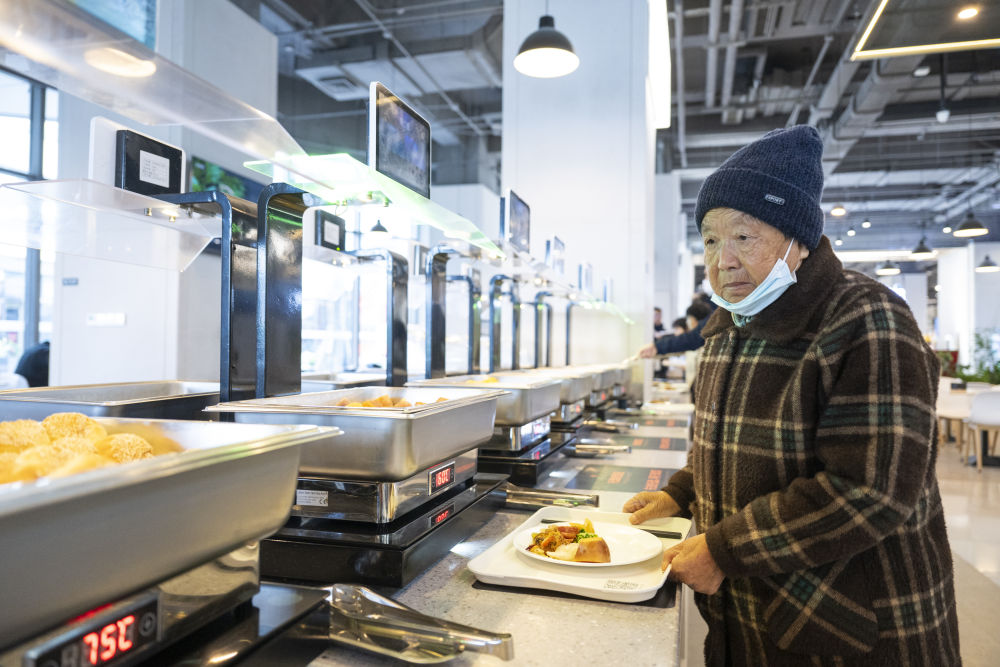 2025年11月25日,老人在雄安新区启动区文华社区华序府智慧食堂内取餐。在这座食堂,居民“刷脸”即可完成身份识别,取餐时系统自动绑定餐盘并实时结算,实现无感支付。此外,取餐区具备智能称重与热量测算功能、健康一体机可以生成健康报告并提供饮食建议。
