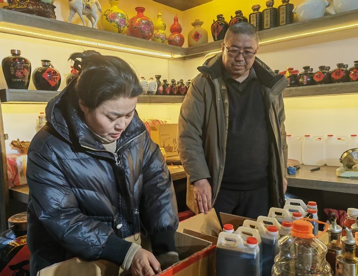 图为来自山东的游客正在碛口古镇的红枣产品专营店里购买红枣醋。记者柴婷 摄