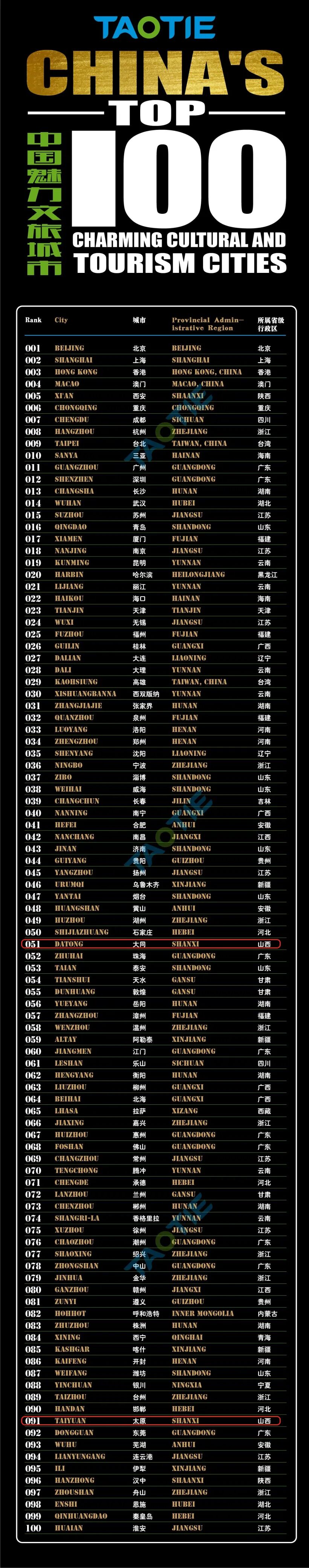 近日,第二届亚洲文旅大赏在澳门举行,《2026TAOTIE中国魅力文旅城市》榜单正式发布。本次榜单实现全国34个省级行政区全覆盖评选,大同、太原凭借深厚的历史文化底蕴与特色文旅创新发展,成功跻身全国百强,分别位列第51位、第91名。