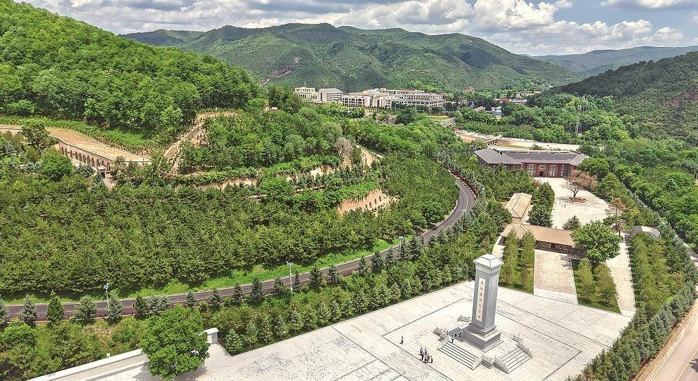 纪念碑一侧,375孔窑洞依山而建,掩映在绿树之间。