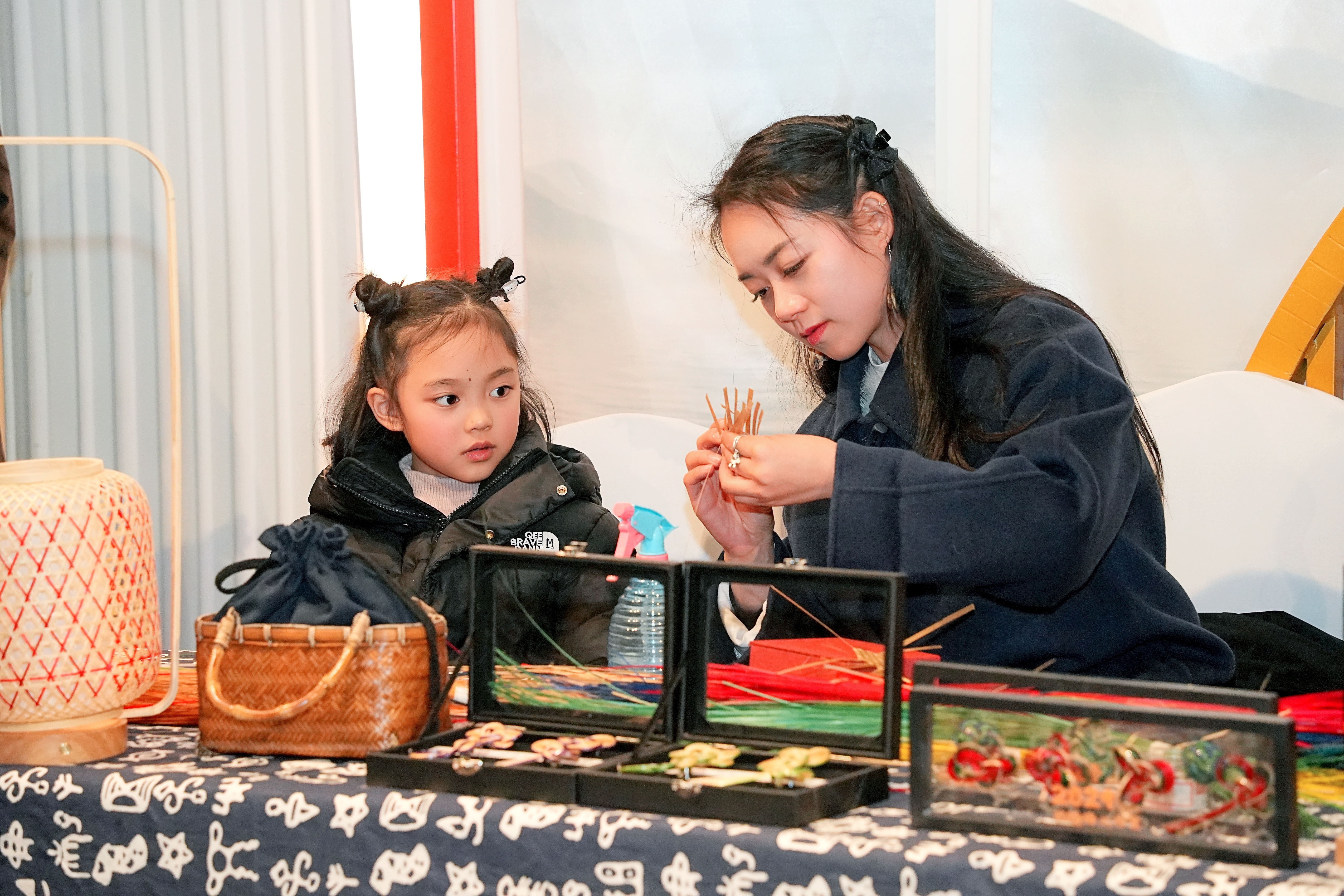 杨隆梅正在给女儿传授竹编技艺。