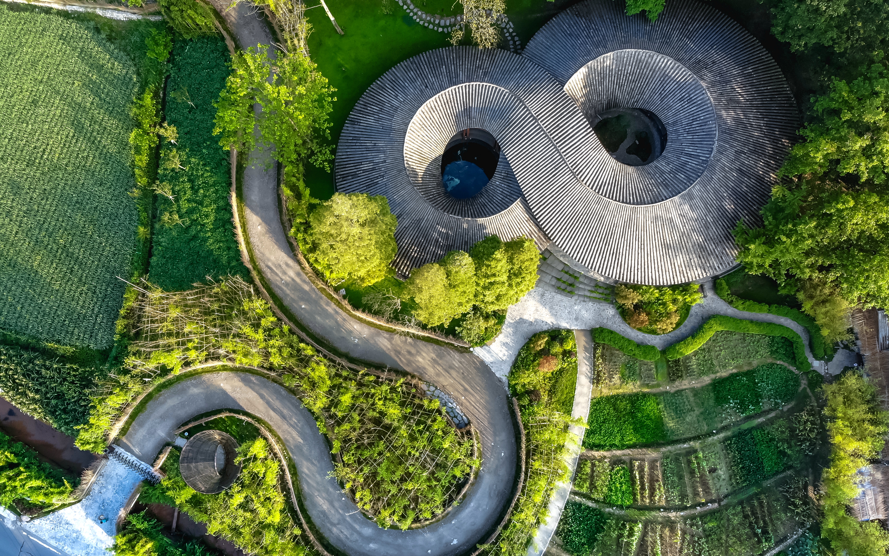 日暮时分,竹艺村的地标性建筑“竹里”被覆上一层金辉。从空中俯瞰这个坐落在竹艺村的“网红”建筑,形状如同数学符号中代表无穷的“∞”。竹文化无穷,竹编路无限,让人不禁期待竹艺村更加精彩的未来……