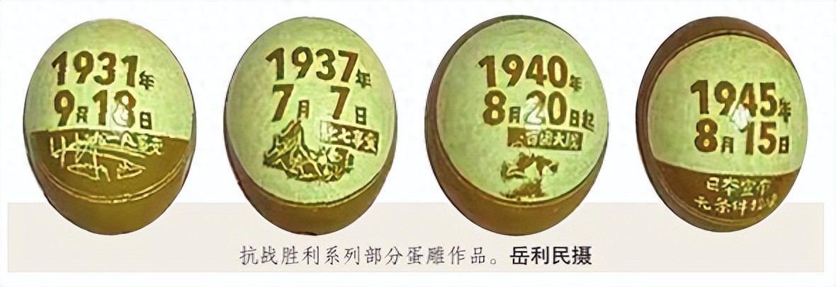 该系列作品遴选了“九一八事变”“七七卢沟桥事变”“百团大战”等12例抗战历史事件作为蛋雕素材,经过20余天的构思与精雕细刻,岳利民让他的“家国情怀”成为了国家记忆的一部分。